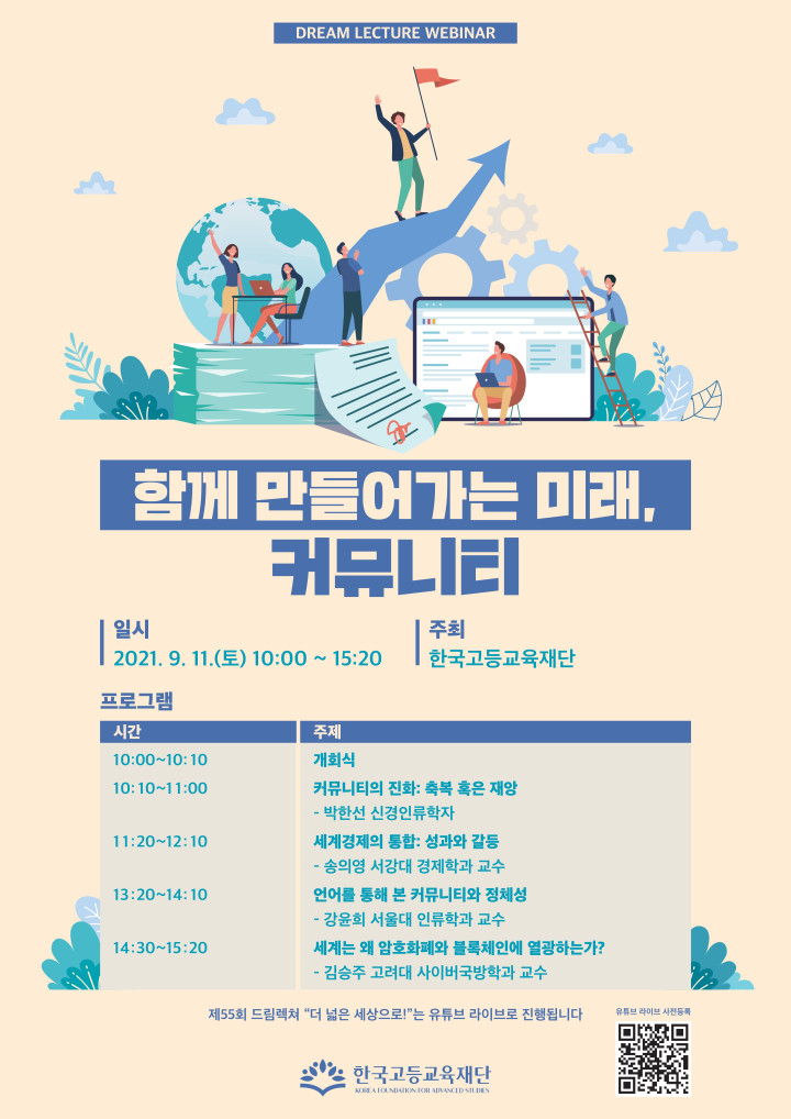 2021년 9월 11일(토)에 진행될 청소년 대상 강연 시리즈 드림렉쳐 웨비나 "함께 만들어가는 미래, 커뮤니티"의 신청을 접수하고 있으니 많은 관심 부탁드립니다.